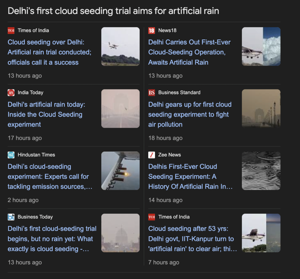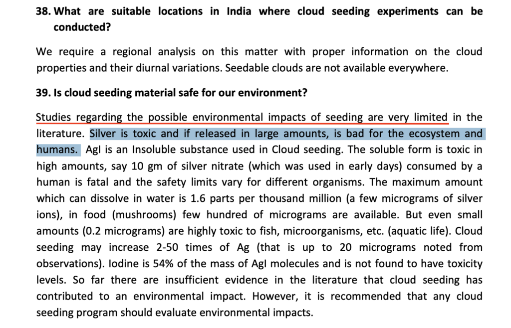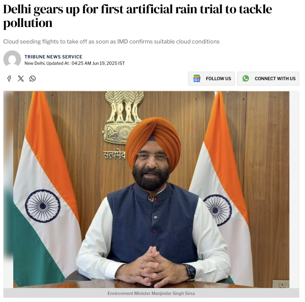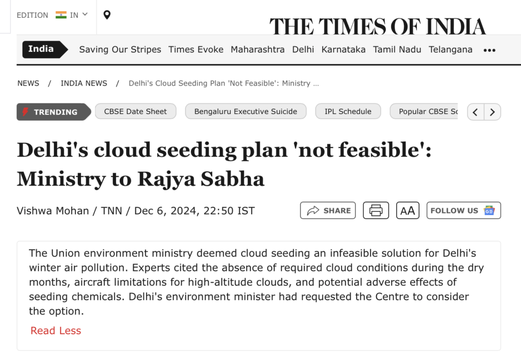 Promoted as a way to ”reduce pollution”, Delhi’s artificial rain-making project is actually attempting to combat pollution by introducing chemical pollutants. Importantly, in December 2024, the cloud seeding initiative was rejected because of concerns about the “uncertainties, efficacy, and potential adverse effects of the chemicals.”