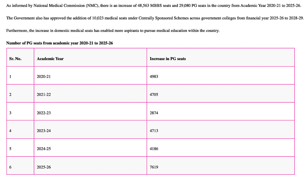 - Additionally, the government has sanctioned 10,023 additional medical seats for government colleges under Centrally Sponsored Schemes for the financial years 2025-26 to 2028-29.