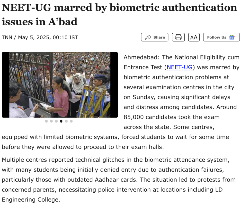 But, the National Eligibility cum Entrance Test (NEET-UG) faced significant biometric authentication challenges at various examination centers in Ahmedabad on May 5, 2025, affecting approximately 85,000 candidates statewide.