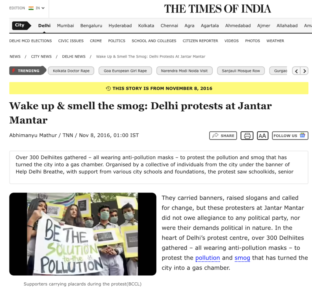 2016 | Jantar Mantar, Delhi | Collective of individuals (“Help Delhi Breathe”) & schools/foundations | “Wake up & smell the smog: Delhi protests at Jantar Mantar”