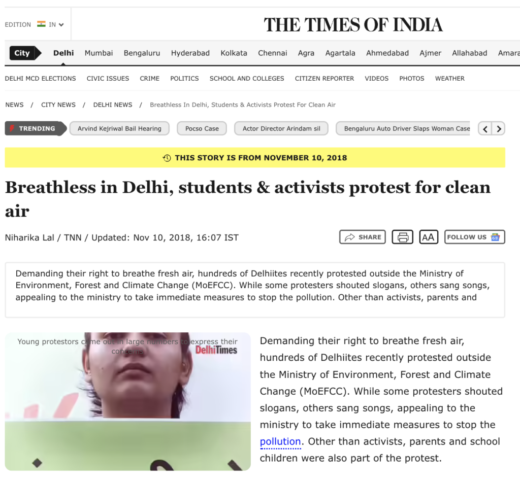 2018 | Near Ministry of Environment, Forest and Climate Change (MOEFCC) or central Delhi zone | Students & activists | “Breathless in Delhi, students & activists protest for clean air”