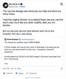 Despite the notable lack of coverage from traditional news outlets, the journalist’s tweet rapidly gained attention, amassing over 25 million views within six hours. This reflects a significant public interest and a burgeoning concern about vaccine safety. The discussion intensified further when Elon Musk shared the post, recounting his own negative experience following vaccination. Musk’s amplification contributed an additional 24 million views, escalating the already heated conversation into a more substantial global debate.